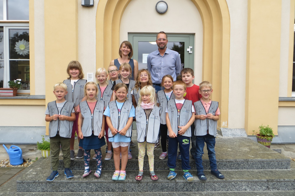 Unter diesem Motto bekamen unsere neuen Erstklässler auch dieses Schuljahr wieder eine Warnweste von der Firma Alkegen aus Kleinreinsdorf durch Herrn Kleditzsch überreicht. Gemeinsam überlegten die Kinder wichtige Dinge, die es im Straßenverkehr zu beachten gilt. Im Anschluss wurden die schimmernden und sehr feschen Westen gleich anprobiert.