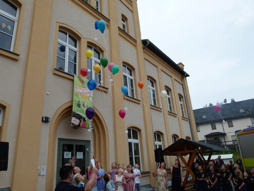 Dort konnten sie ihre ersten Schulbücher durchstöbern und einpacken. Ihre Klassenlehrerin Frau Blase und ihre Erzieherin Frau Wobst führten die neuen Erstklässler in den festlich geschmückten Gemeindesaal, wo bereits Eltern, Geschwister, Großeltern und Gäste auf die Schulanfänger warteten. Mit einem tollen Programm begrüßten Schüler und Schülerinnen der Klassen 2, 3 und 4 ihre neuen Mitschüler. Es wurde gesungen, getanzt und gespielt. Mit einer Sonnenblume aus unserem Schulgarten wurde jeder Schulanfänger feierlich in die Grundschule aufgenommen. Nach dem gemeinsamen Rückweg, begleitet vom Einsatzwagen der Freiwilligen Feuerwehr Teichwolframsdorf, erlebten wir an der Schule eine beeindruckende Begrüßung durch die Martinshörner. Traditionell überreichten die Mitglieder der Freiwilligen Feuerwehren die Zuckertüten, was den neuen Erstklässlern ein strahlendes Lächeln ins Gesicht zauberte. Zum krönenden Abschluss ließen sie einen Luftballon mit herzlichen Grüßen in den Himmel steigen. Bereits einige Ansichtskarten mit lieben Grüßen für die 1. Klasse sind von den Findern bei uns eingetroffen.